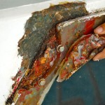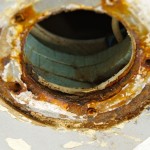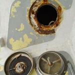 My starting point is the little vent in the kitchen. Sometime ago there was also an electric ventilator installed but corrosion has eaten it away probably years ago. The Vetus vent itself, I replaced back in Moorea as the old one didn’t even close properly. But somehow water still found it’s way in – so I remove it completely and discover some realy nasty stuff: The leak probably existed for many years and not much is left of the 4mm of steel that our deck is made of. So I start the old game: first hammering the loose material away, then brush the metal until it looks somewhat stable. After cleaning it, I soak everything with phosphoric acid. Half an hour later the acid has done it’s magic and converted all the rust to black ferric phosphate. Now I clean again with freshwater and let it dry. The epoxy primer appears on stage and gives the ugly spot a nice, watertight cover. During the next days, I will paint additional layers of white polyurethan paint. Time will tell how that combination works out….