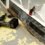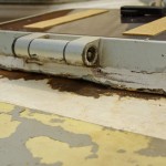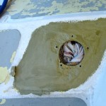But as I’m already at it, I crawl around on deck and open more and more rust spots. Some are easy, others quite nasty. The always leaking bathroom window was missing a fitting underneath the handle and the window itself wasn’t glued to the deck with Sikaflex or 3M-50200 but instead sat on a 1cm layer of filler (the one that is used for fixing bumps in cars *rrr*). In general I usually uncover two or three generations of household silicone which if at all is only to be used inside the ship. – Well it’s an amateur construction, one can tell.