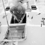 We discovered that the hatch on the foredeck also leaks water *underneath* the frame and onto our children’s beds. So I take the whole hatch off and again ramove three layers of silicone and cheap one-component paint. I polish the aluminium frame and after painting everything in the above mentioned manner, I glue it back in with Sikaflex. Also I turn the whole hatch a 180˚ so it now opens to the front. That will let a lot more air into the cabin and make our life more enjoyable in those hot regions we’re cruising in.