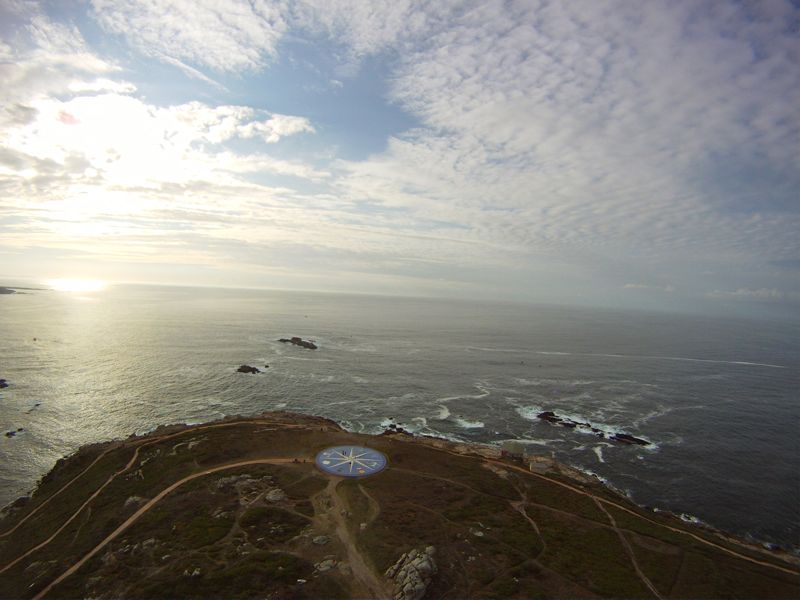 Das Ende der Welt. Als dieses galt fuer lange Zeit das Cabo Finisterre, welches gerade aus dem Seenebel vor uns auftaucht. Die Sonne scheint und wir haben kaum Wind, weshalb wir unter Motor unsere Freunde von der SY Chiloe und der SY Tamora verfolgen. Aber eigentlich sollte ich noch ein Woertchen zum gestrigen Segeltag verlieren: Wir liefen also den gesamten Tag mit Halbwind oder Raumwindkurs und stets ueber 6 Knoten (schnell) die Kueste entlang. Wie so oft verlief der gesamte Tag ohne einem einzigen Segelmanoever – bis kurz vor Camarinas, wo wir einmal halsen mussten. Und hier passierte es: Eine Welle befoerderte den Grossbaum etwas schneller als geplant nach Steuerbord. BLAMMM !!! Unser schickes, 30 Jahre altes Grosssegel ward zweigeteilt. – Ein vier Meter langer Riss verlaeuft etwa einen Meter ueber und parallel zum Grossnbaum. Tja. Es hat uns bis hierher nach Spanien gebracht und war immer gut zu uns. Heute motoren wir also nach Muros und von dort – einen ‘Ria’ weiter in Caraminal sollte dann eigentlich schon das neue Grosssegel, welches wir in Flensburg bestellt haben, auf uns warten. Die naechsten Tage werden wohl Suedwind und auch Regen bringen, weshalb wir vermutlich ein paar Tage am selben Fleck bleiben werden. Vielleicht fahren wir ja auch mit dem Bus rueber und holen unser neues Segel… So. Im Cockpit laeuft gerade ‘Elmundo Jazzfunk’ genauer gesagt: Asiko von Tony Allen. Ouuuu yeah !! Und es ist 12:00h – vielleicht goenne ich mir heute mal ein Mittagsbier ? Mal sehen. MAHLZEIT !