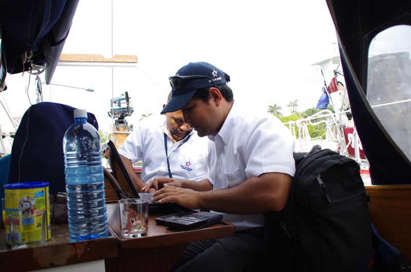 Friday we get ready and give our kids to the SY Mares, while Gui and me get aboard the Tamora to go to the ‘flats’ (the anchorage in front of Colón) where the advisor is to come aboard. We’re in a hurry as the time for the passage was moved from 16h to 14h and we still have to get some fuel. Bas, the fourth line handler could not be found in the hurry and was replaced by Marissa from the SY Tevakenui, who only had five minutes to prepare. :-)
