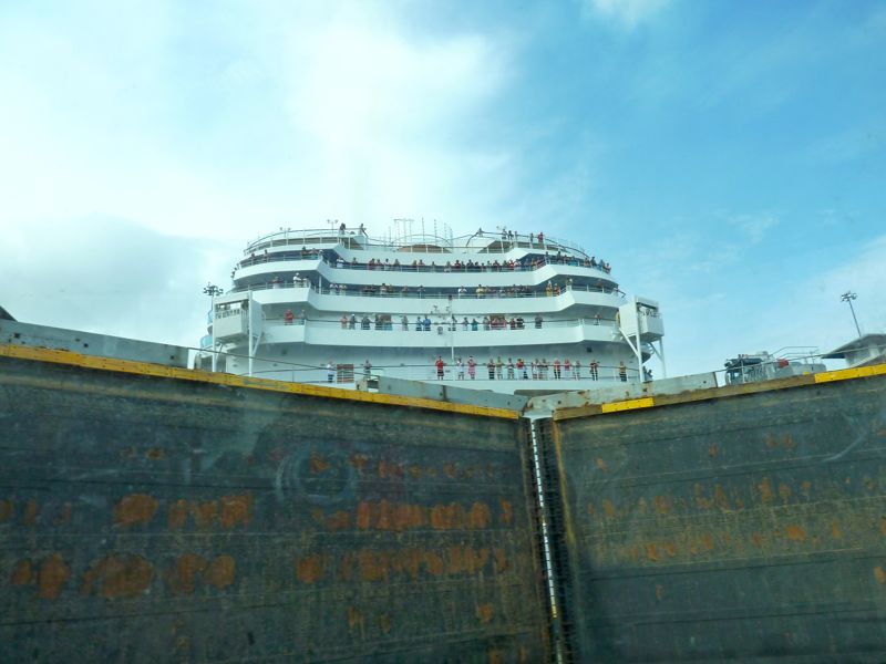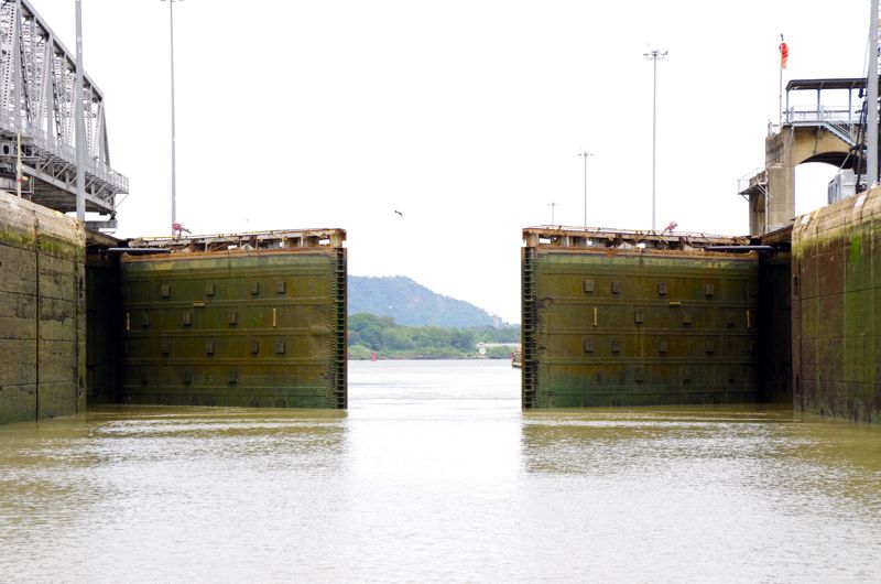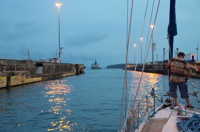 Next day at 16:00h a big pilot boat closes in and drops of a very friendly advisor. Just two minutes later we’re on our way to the Gatún locks, where just in front of the first one, we go alongside with the Kira to form a pack of two ships. A big freighter from the Philipines is going into the lock in front of us and seconds later the monkey fists are thrown towards us. We connect the lines to ours and get into position in the first of three locks on the atlantic side. The lines are pulled up and as soon as they are tied up, the lock closes and water flushes in.