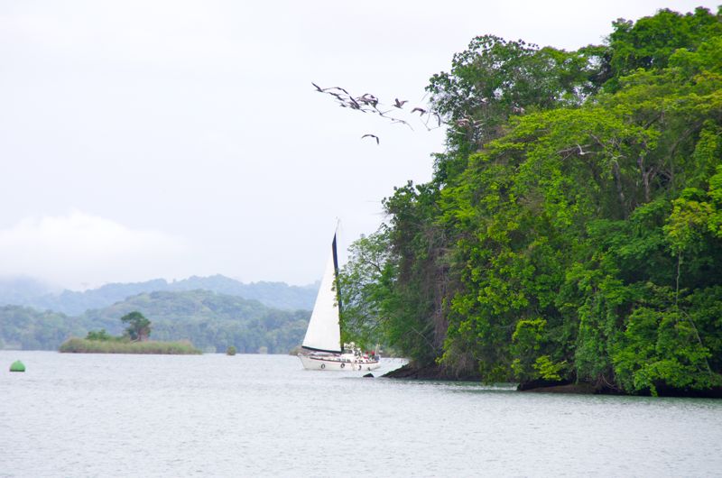We have a excessive birthday party and when the advisor arrives at 06:15h in the morning, nobody has had any sleep. :-) With small eyes covered under sunglasses, we enter the ‘Banana Cut’ (a shortcut) and sail slowly in between little islands covered with rain forest, while we try to catch up with our sleep. At around noon we arrive at the first lock on the pazific side and again everything runs smooth while we go down the three locks together with the Kira.