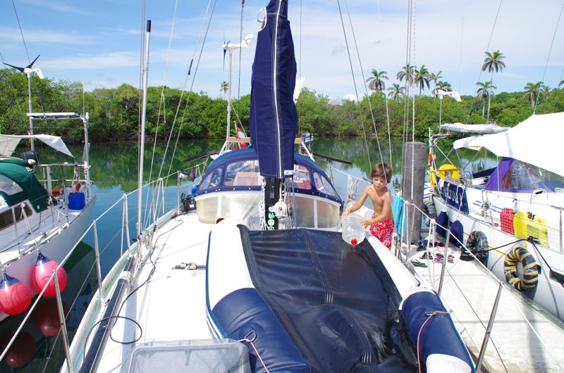 So we play a little with the water and empty our cans with water from Kuna Yala. We’ll fill them up again, when we reach the Gatún Lake.