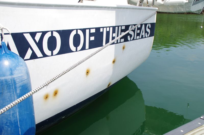 The skipper could no longer idle around and grabbed screwdriver and steel brush to open around fifty little rust nests around the ship. Everything was taken care of with anti-rust and paint and three days later the ship looks a lot better. Unfortunately I couldn’t finish with the cover paint as today it was raining nearly constantly. – Well, this will have to wait, then…
