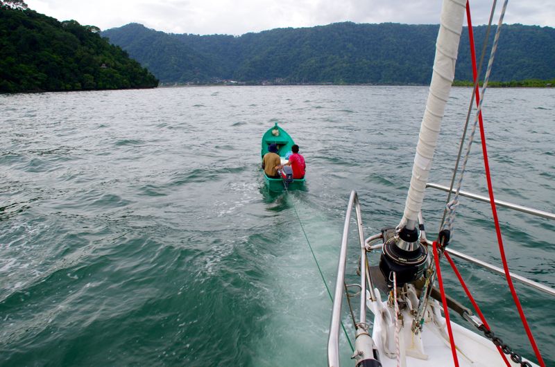 Both wind and current stayed with us right up to the entrance of Golfito – and exactly here the tide turned and the wind died. We were pushed outwards, back into the golf again. What to do ? Well, get the dinghy and outboard into the water and try to pull the Rancho Relaxo into the bay. But this was way harder than imagined. With the small dinghy and a four (!) hoursepower engine, we only made 0.4 knots. Two fishermen in a bigger dinghy were close by and we asked them for help. Two minutes later we were underway, doing two knots and feeling safe again.