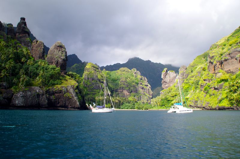 The first island we sat foot on after crossing the Pacific Ocean was Fatu Hiva. The island is quite small – about seven miles in north/south direction – and extremely green. When doing landfall in the Galapagos, we could smell the volcanic rocks far out on sea. Here, the breeze was carrying the scents of flowers and fruits. The way up along the west side of the island was long and tiresome as there was no wind and without engine, we had to relay on the little wind we had. But it even got worse when we had to enter the bay. There was either no wind or strong gusts falling down from the mountains. It took us nearly three hours to get to our final position.