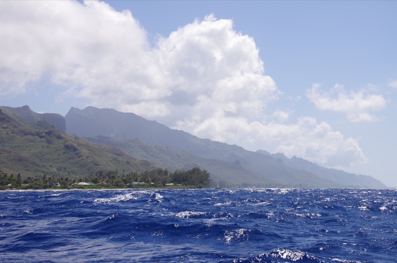 The anchorage at Maeva beach is known to be very calm but still we were surprised to find ourselfes in a force six after just a few minutes running north. We had to wait for a landing airplane at the airport of Faaa before we were able to continue our journey. After passing the runway we set sail in papeete harbour and left the island with the small genoa. The passage was very fast and quite pleasent. It really was a good thing to be on the move again after such a long time at anchor. Our joy was a bit shortened bya a mayday call from a polynesian yacht that hit the reef in the Passe Tareu – that’s the entrance to the Baie d’ Opunohu which was our goal !