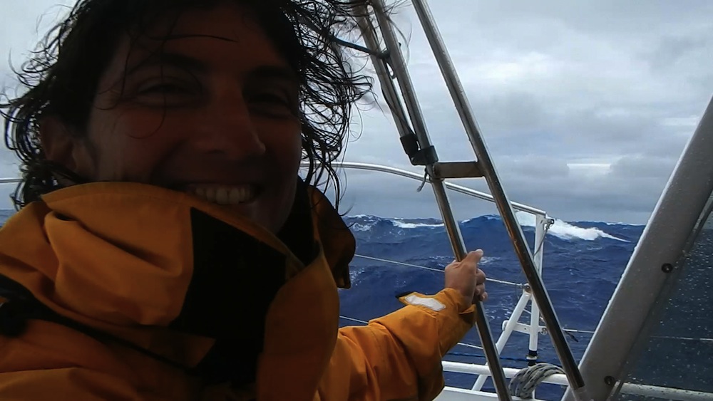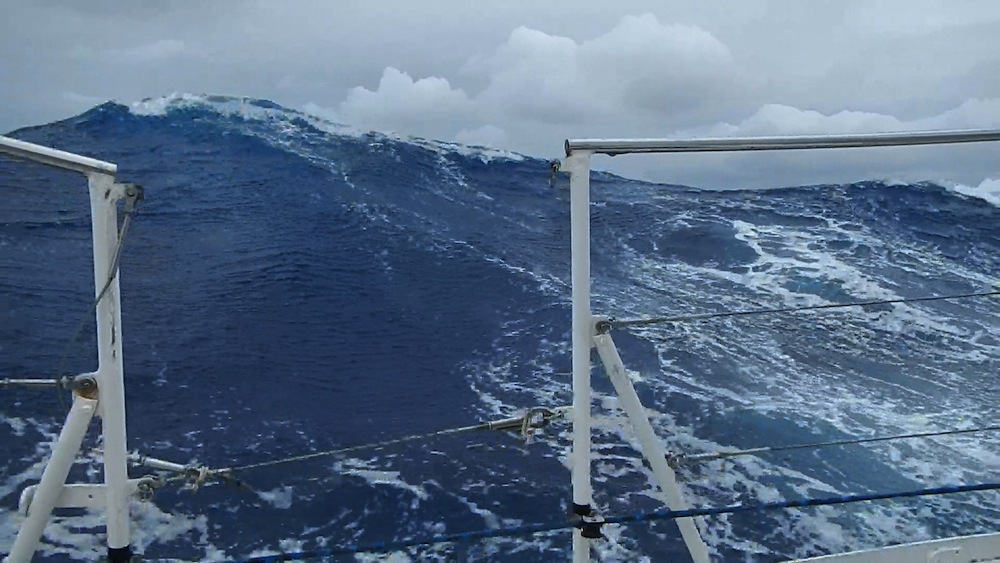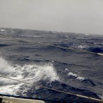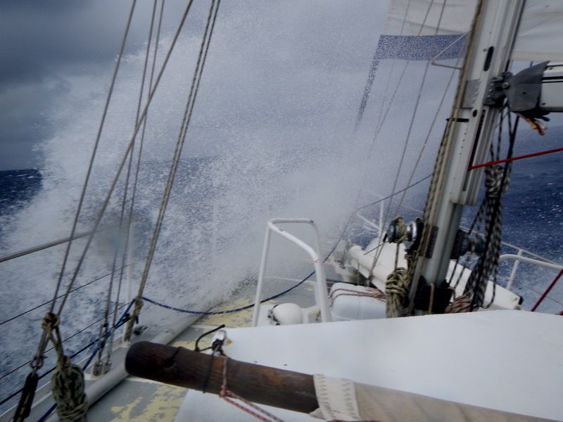 The front was clearly visible in the morning after breakfast and when it hit, the wind turned 180 degrees and increased to about 40 knots at which it stayed pretty much all day. After a few hours, the sea picked up and nearing the end of the storm we had waves reaching well above five meters. Despite the rough seas we still did 4-5 knots, going against the wind with the main and genoa in the third reef.