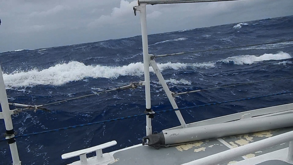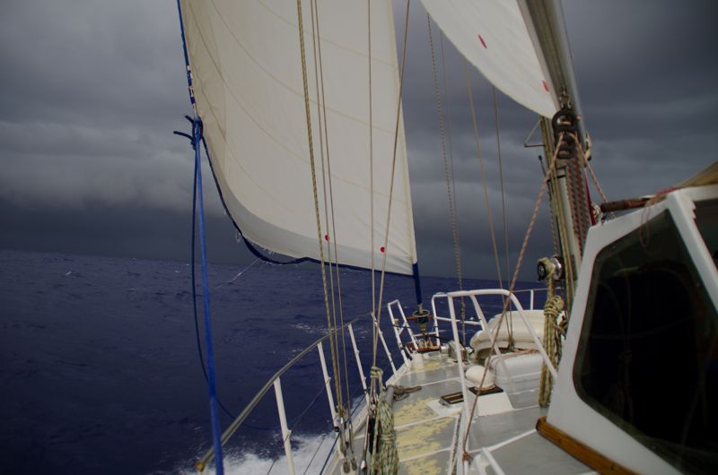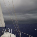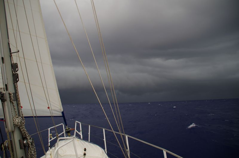 On our way towards Tonga we ran into a front / through. As the thing really looked weird on our weather maps we prepared ourselfes for the worst – and pretty much got it. Luckily for us, the storm hit during daylight which is a lot less freightening than having strong winds in the pitch black night. Lucky for you too as you get some scary pictures (and maybe a video later on).