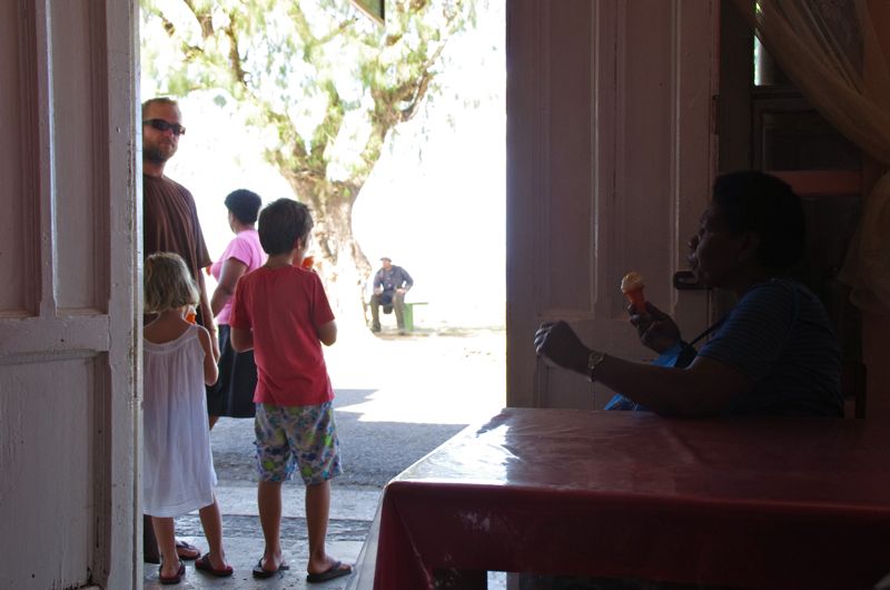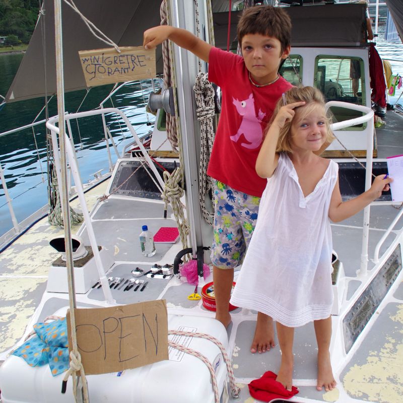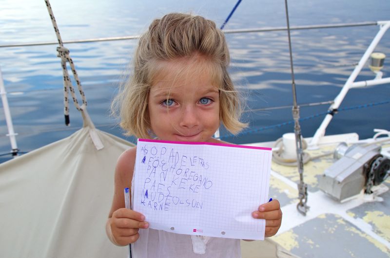 Alright. Enough of the ranting. There are also some pics of our little hike up the hill to the little freshwater pond. On the way the kids got a little toy cooking set and when we were back on the ship they promptly openend a restaurant on the foredeck. Let’s see if someone can decypher Viola’s menu. It’s a wild mix of german, spanish and english but it shows promise and she’s definately not lacking inspiration. Also – she’s still just five. :-)