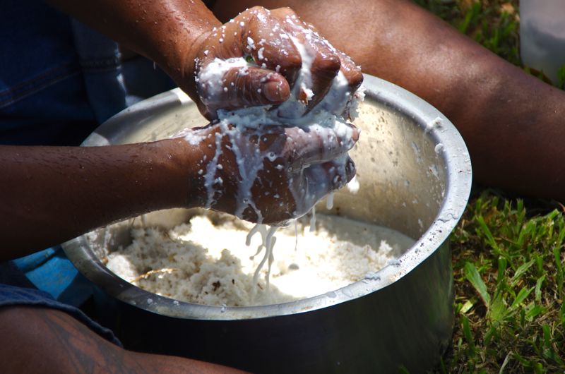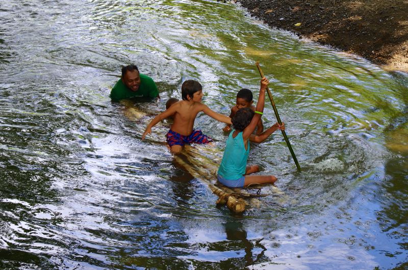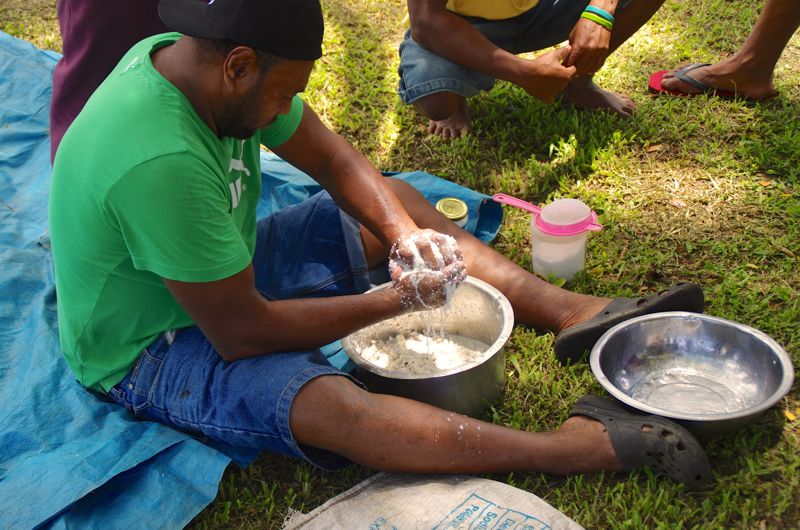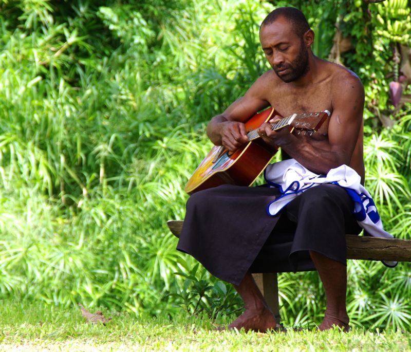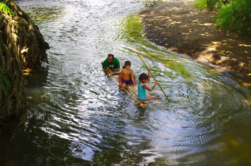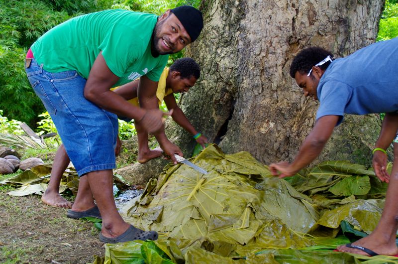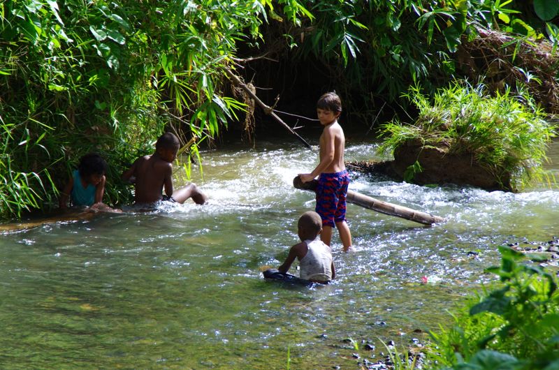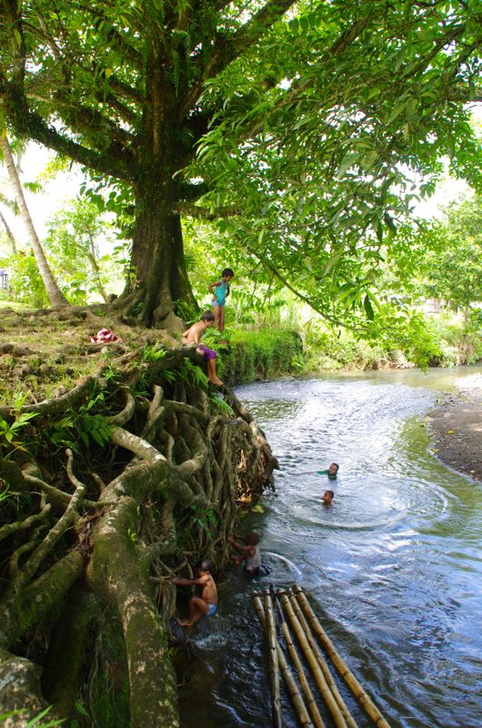 The food got prepared the traditional way with heated stones, covered with palm and taro leaves. In the lovo were prepared: wahoo, chicken, pig, taro, breadfruit, little packages of fish with onions wrapped in taro leaves and steamed in coconut milk, etc… The feast was awesome ! After that we hopped in the nearby river for refreshment and the men (yes: only the men) sat together to drink cava and sing traditional songs. The kids spent all afternoon in the water, jumping from trees or paddling along with a little bamboo raft. This christmas will be one of my favourite memories of that journey so far !