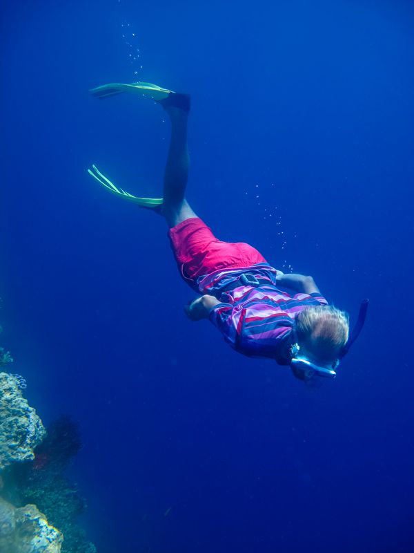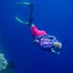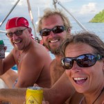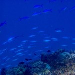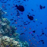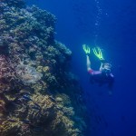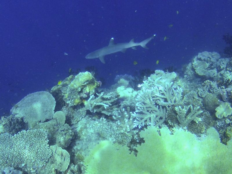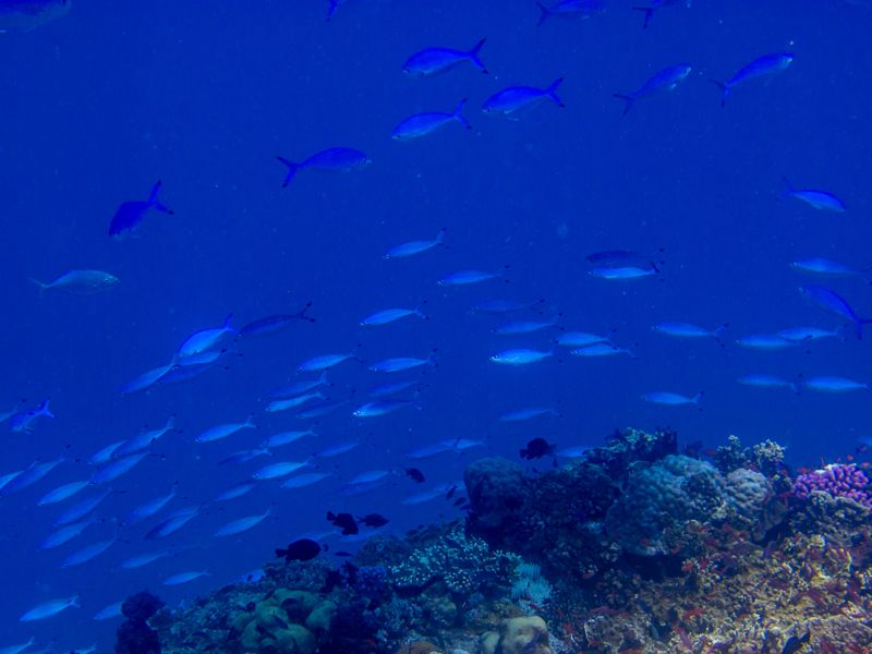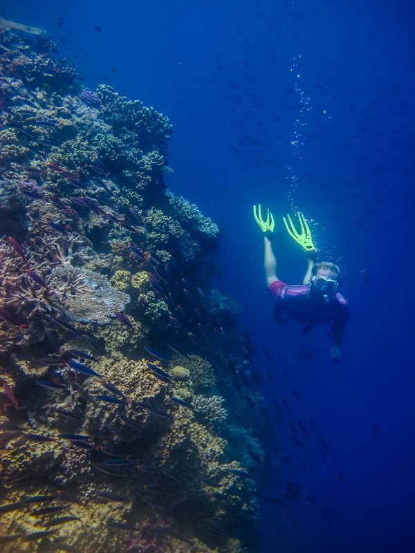 The sea is calm and the visibility under water quite good. Sitting in the dinghy we can make out the dive spots and decide to go for a quick one at ‘Grand Central’ while Jason and Melanie are snorkeling with the incoming tide and drift over the reef back towards the yacht.
