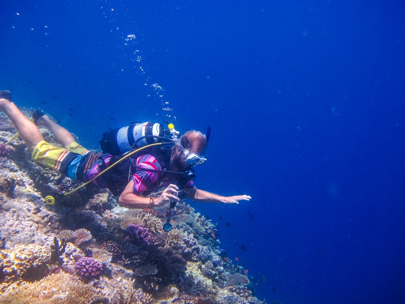 Jason benutzt eine Canon G12 und zusaetzlich das ‘Canon WP-DC34 Underwater Housing’. Beides zusammen ca. 500 Euro. Aber lohnt sich allemal. Die Kamera hat einen deutlich groesseren Bildsensor als normale ‘Kompakt’kameras und das merkt man bei jedem Foto – natuerlich umso mehr noch unter Wasser. Tolles Teil !