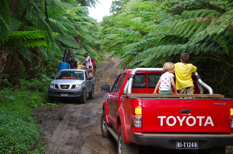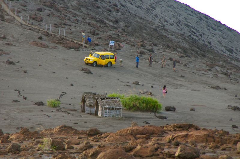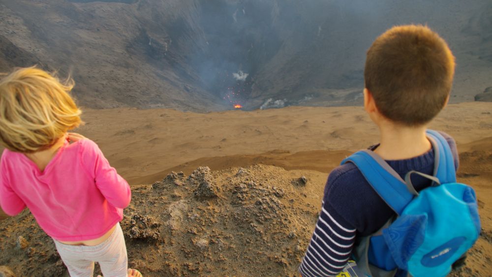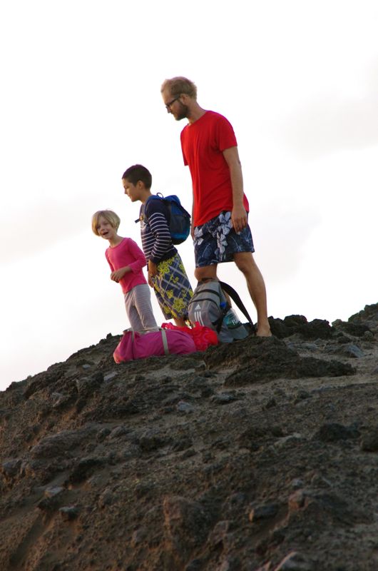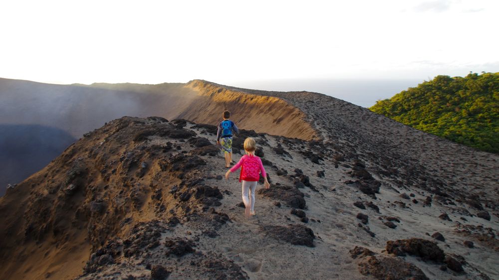 Yesterday the time has finally come and at noon we started to walk towards the volcanoe. The ‘road’ leads through thick, lush jungle and a few villages and after about 2-3 hours, we arrived at the entrance to the volcano national park. Our lucky kids got a ride up the volcanoe while Gui and me walked up. All the time with loud rumbling noises and while the floor starts to shake. The earth underneath us is alive !
