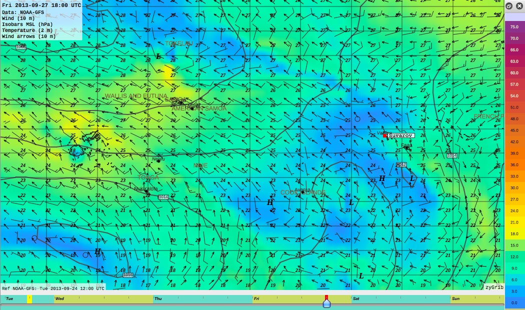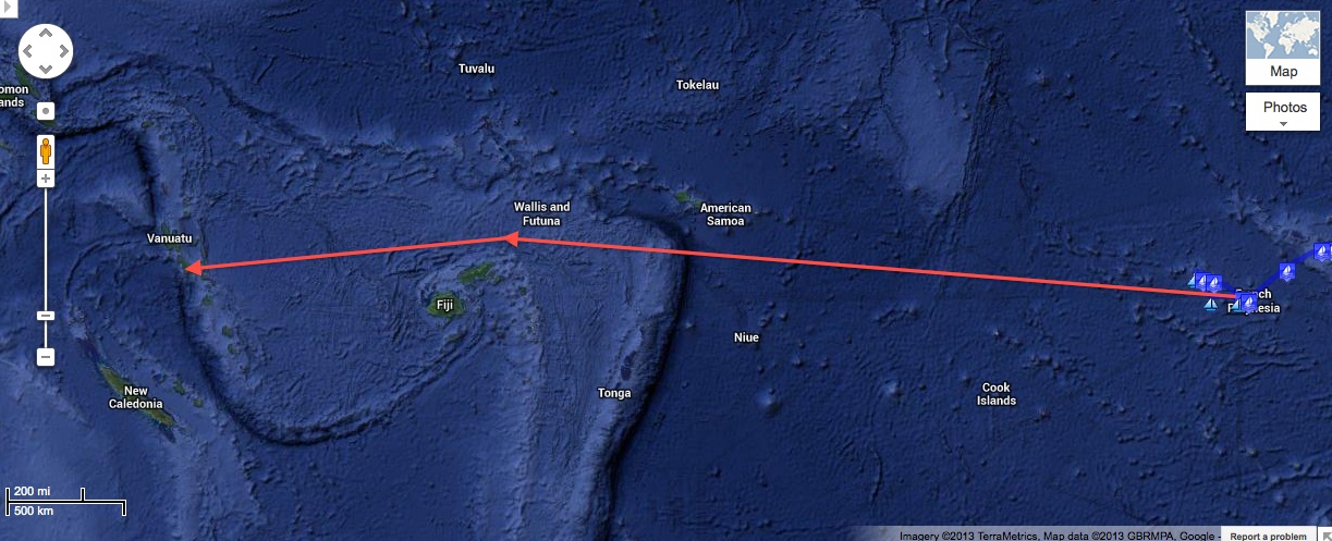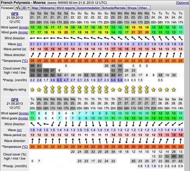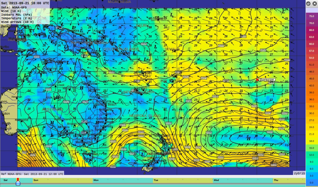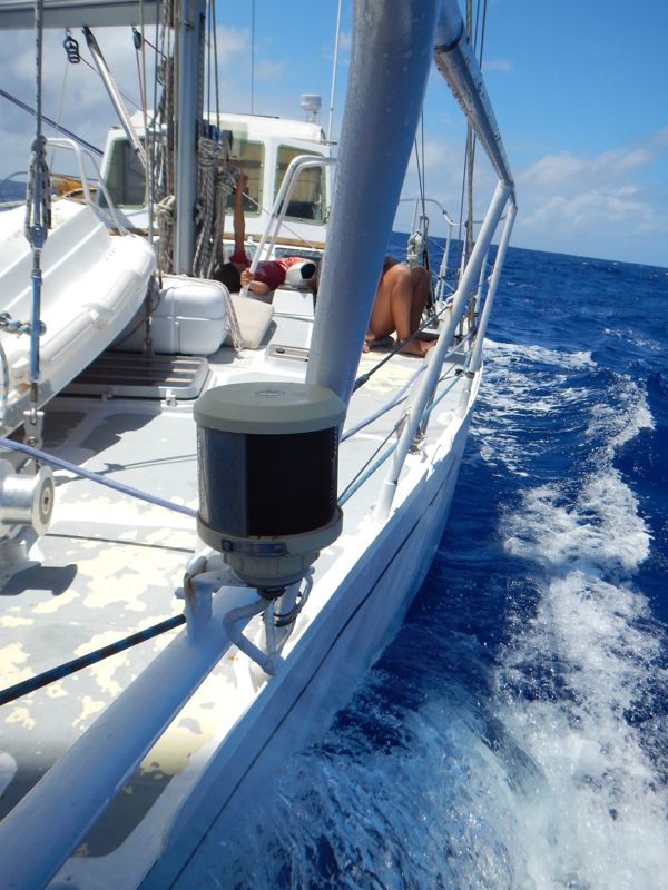 So und dann wie immer der Wetterbericht: Wir zuckeln noch immer mit Schwachwind dahin, ist aber ok so. Ueber Tonga breitet sich inzwischen eine Flautenzone aus. D.h. die LosLocos werden dann wohl mal noch ein paar zusaetzliche Tage einplanen muessen. Eieiei. Naja. Noch haben wir ja Wind, wollen wir hoffen, dass der Wetterbericht in dem Fall falsch liegt.