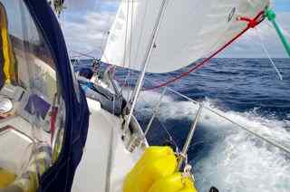 Ach ja und das mit der Stirnlampe ist gestern Nacht passiert, als unsere Rollreffanlage klemmte und ich diese am Bug teilweise in freiem Fall auseinandernahm und wieder gaengig machte. Hierbei flatterte mir die Genua mit ihren Schoten gehoerig um die Ohren und hat mir dann die Stirnlampe vom Kopf gestreift. Tja. Hab erst vorgestern neue Batterien rein ! Sowas aergerliches auch. Ansonsten ? Die Kinder sind prinzipiell wohlauf, Viola ist seit heute morgen auch etwas wortkarg, hat aber das Fruehstueck bei sich behalten. Bruno liest Asterix und schnitzt an seinem Segelboot. Fisch haben wir noch keinen gefangen, doch war Gui vorgestern mal unterm Schiff tauchen und hat sich unsere Entenmuschel-Kolonien angesehen. Die gedeihen hier praechtig ! Aergerlich, vor allem, weil das Abkratzen hier in der Pazifikduenung so gar keinen Spass macht und auch nicht ungefaehrlich ist.