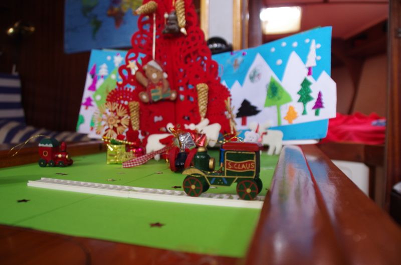 Wie auf einem Bild zu sehen, ist die Suvarov schon festlich geschmueckt. Die Kinder hatten irren Spass dabei, Kugeln, Girlanden und kleine Engel ueberall anzubringen und Viola hat stundenlang Papiersterne ausgeschnitten und um’s Cockpit geklebt. Ansonsten bekommt man vom Jahresend-Konsumfest hier nicht viel mit. Kein Shoppingrummel, keine gestressten Menschenmassen auf den Strassen, keine dieser furchtbaren Weihnachtslieder. Richtig schoen.
