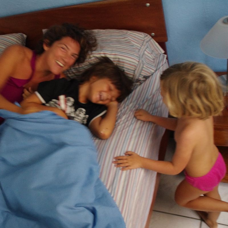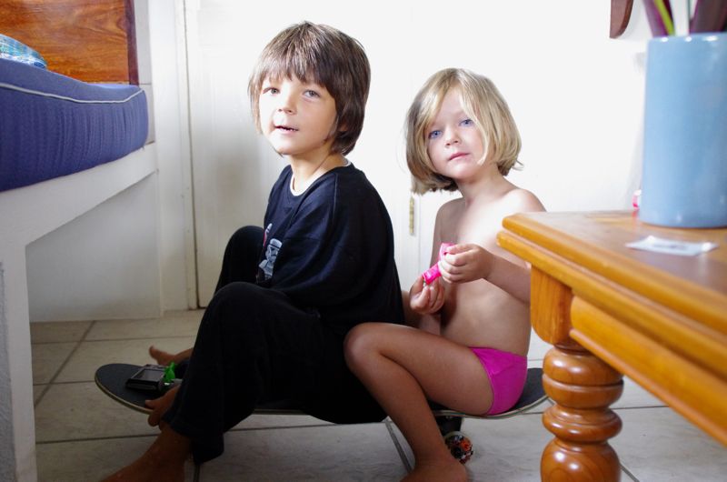 The first night, the kids spent on the Express Crusader, the next on the Rancho Relaxo. And as our friends are both switching their work/family role tomorrow, we’ll be seven for one more night. But the kids are a delight ! All are adorable, intelligent and calm and together the five are so in harmony that it’s a real treat. After the breakfast they started paperwork involving drawing, painting, writing and making books and booklets. I had to leave for errands but it continued with yoga, dancing and culiminated, throwing sand at each other on the beach. In the evening the five got a shower aboard, had dinner and went to bed after a movie (with a book and a flashlamp) each. What more could you want as a kid or for a kid ?