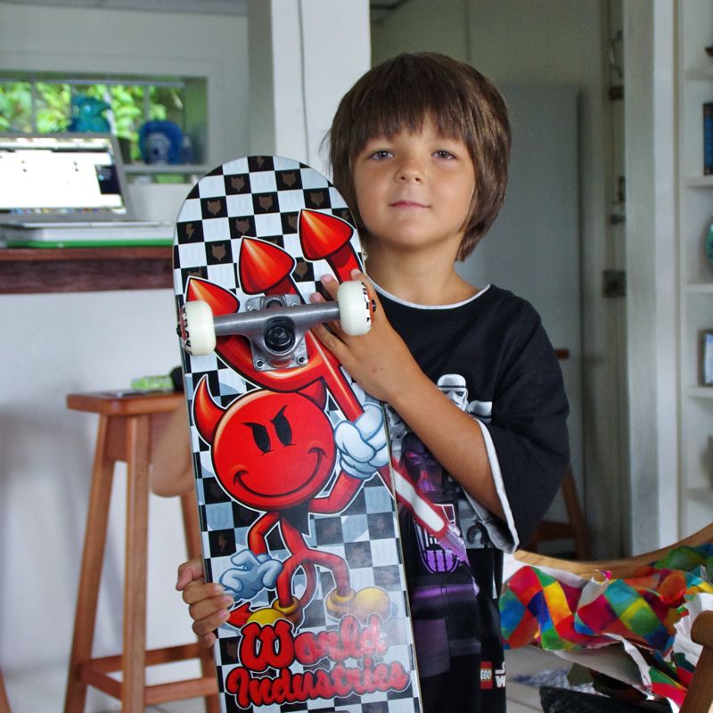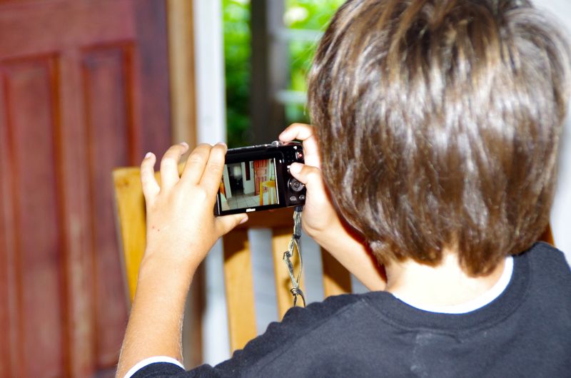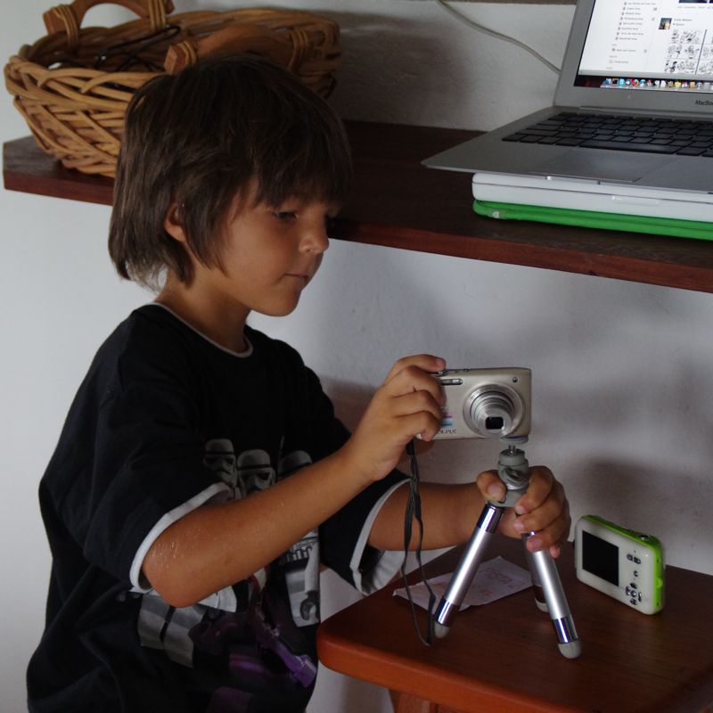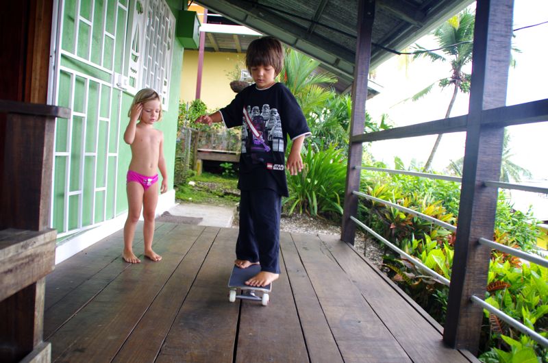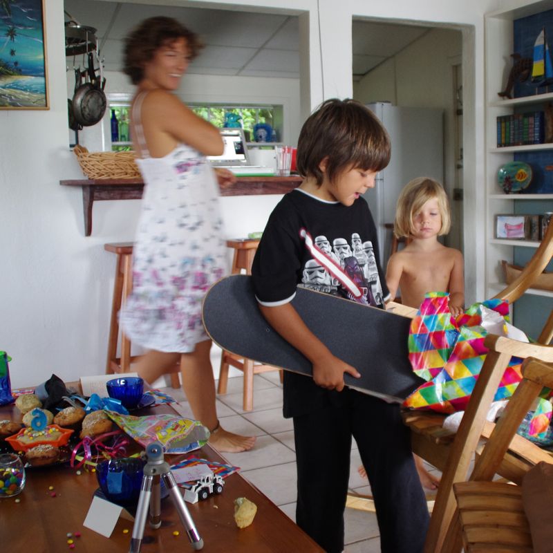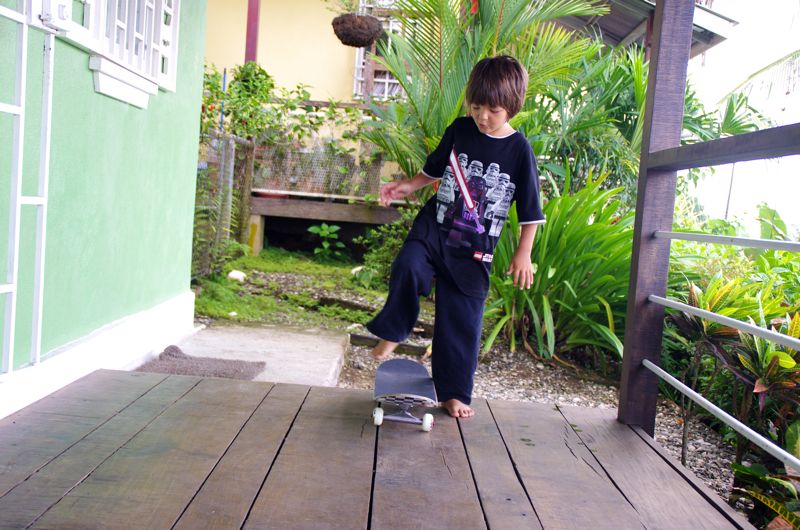 Bruno woke up first and everybody jumped into his bed to give him a first happy birthday kiss. Viola led himinto the little living room and the celebrations began. And somehow, magically we found the perfect gifts: a big set of cooking utensils, a little digital camera and a SKATEBOARD ! Our little hero is just as happy as we are. Now we’re off into the jungle to test Bruno’s new camera.